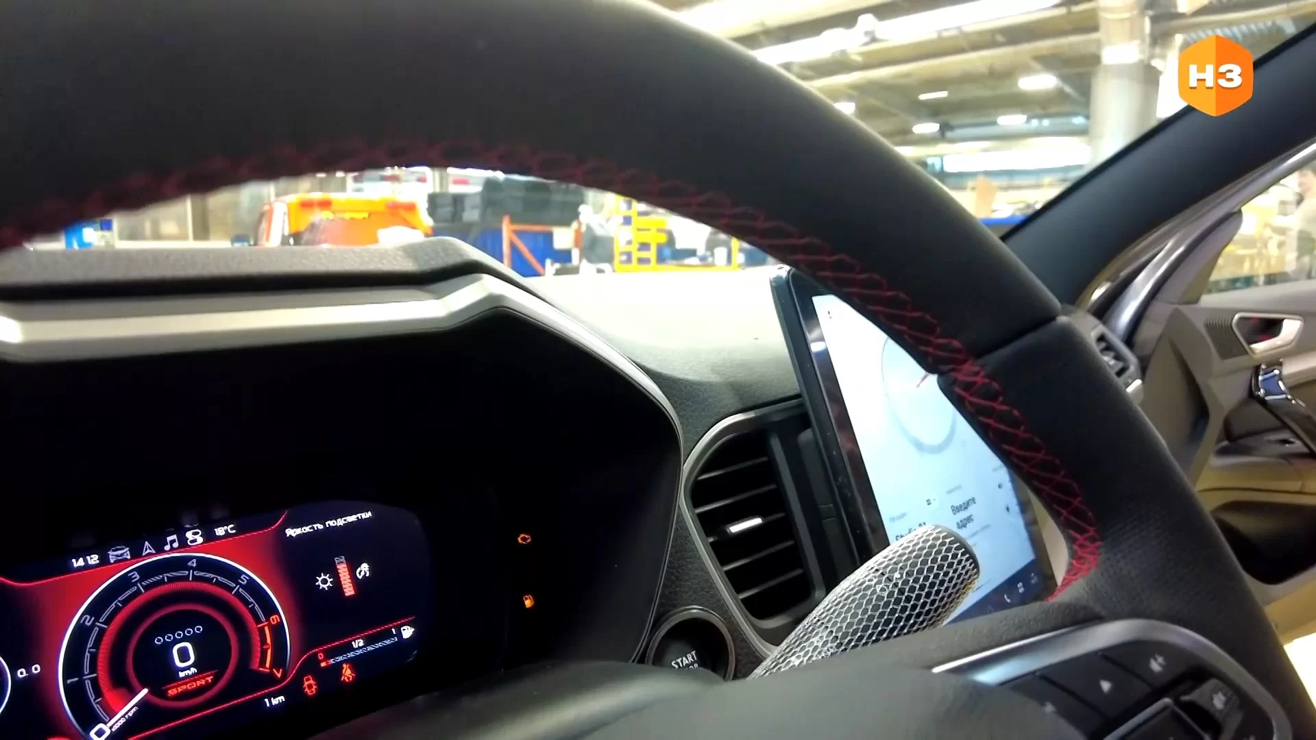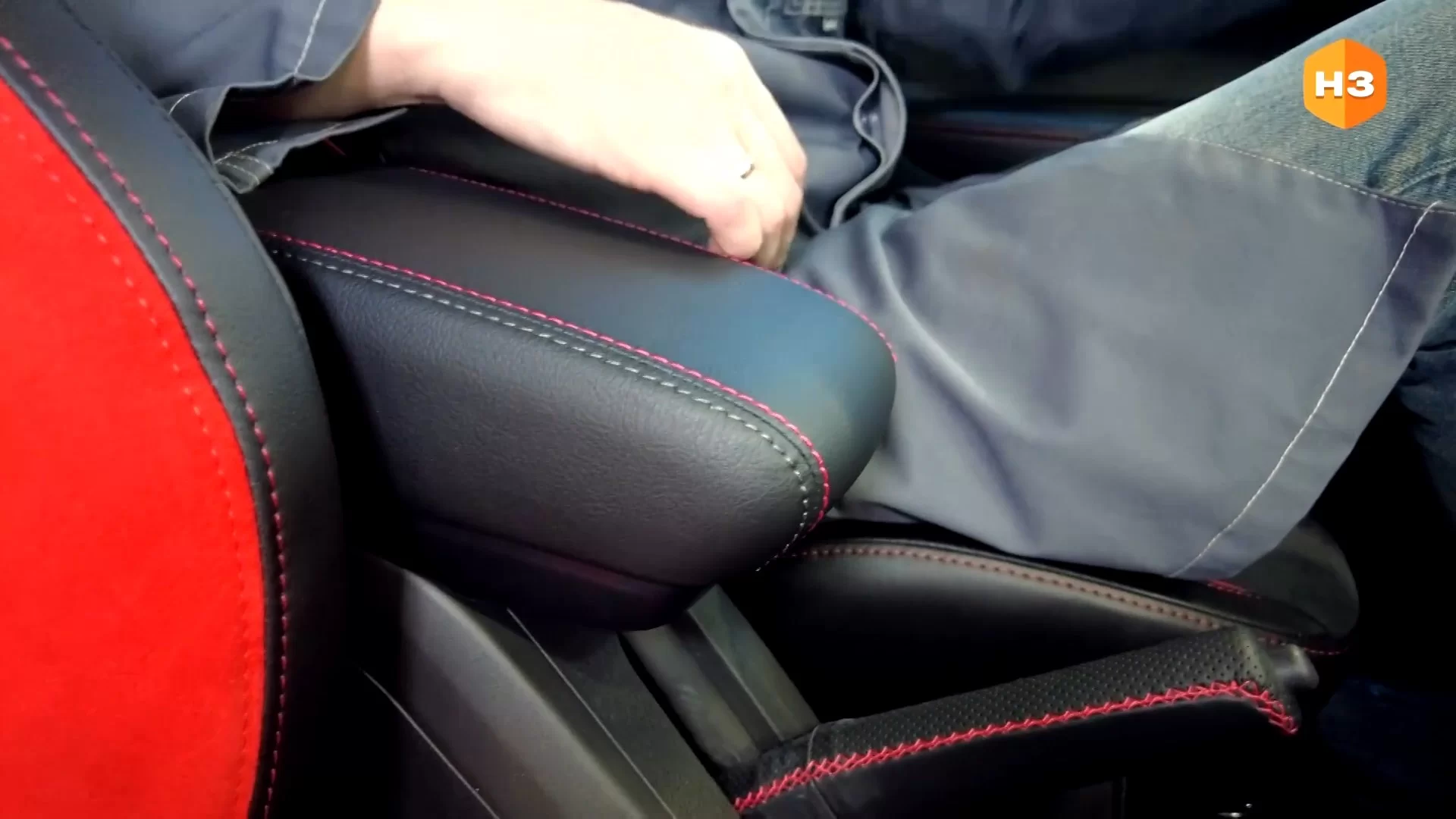 Все элементы (органы управления, чехольчики, накладочки) выполнены в нашем фирменном стиле. То есть такой же черный с красной прострочкой. Ровно то же самое на руле. Руль с обогревом, как и на серийном автомобиле.