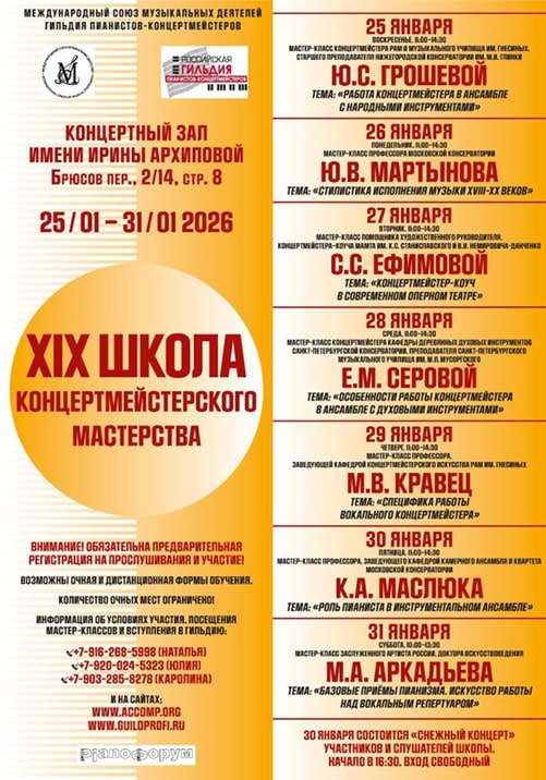 С 25 по 31 января 2026 года в Москве пройдёт XIX Школа концертмейстерского мастерства.