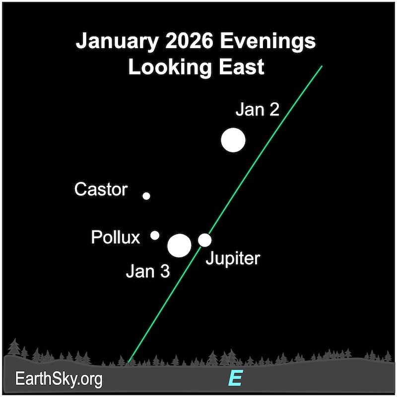 The January full moon is the Wolf Moon and it’s a supermoon. It’ll occur overnight on Jan. 2 to 3. The crest of the full moon falls at 10:03 UTC on Jan. 3. That’s 4:03 a.m. CST for folks in central North America. So the moon will be at its fullest on the morning of Jan. 3, but it will appear full on both nights, Jan. 2 and 3. It will glow near bright Jupiter and the twin stars of Gemini, Castor and Pollux. (Courtesy EarthSky.org)
