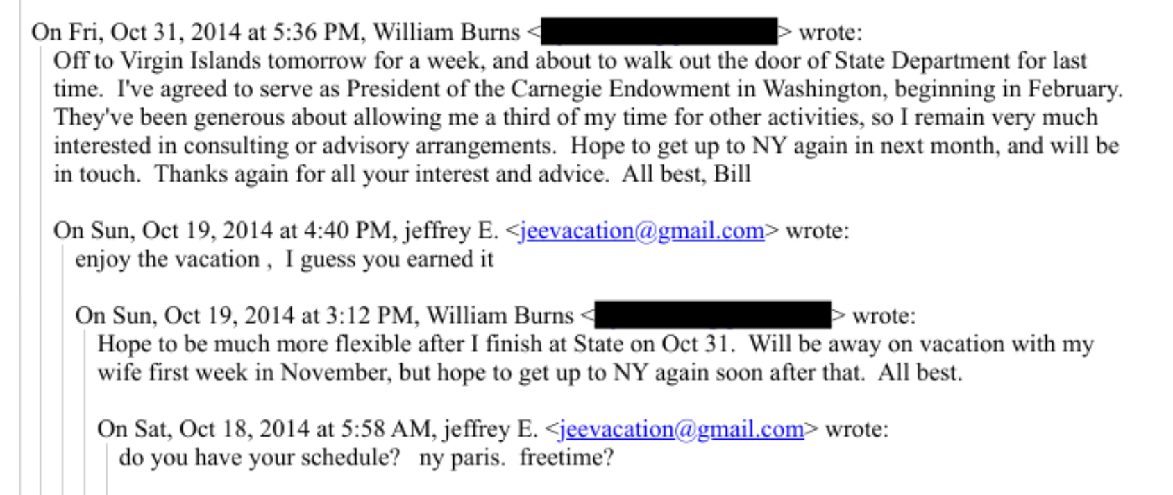 "Off to Virgin Islands tomorrow for a week, and about to walk out the door of State Department for last time," Burns wrote at 5:36 p.m. on his final day as deputy secretary of state. "I've agreed to serve as President of the Carnegie Endowment in Washington, beginning in February. They've been generous about allowing me a third of my time for other activities, so I remain very much interested in consulting or advisory arrangements. Hope to get up to NY again next month, and will be in touch. Thanks again for all your interest and advice."