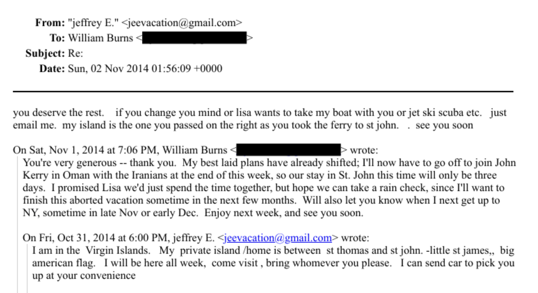 Epstein responded by saying he was "in the Virgin Islands" at his "private island/home" and would "be here all week." He told Burns to "come visit" and "bring whomever you please" and offered to send a car. Burns called Epstein "very generous" but said his vacation plans had "shifted" as he had agreed to "go off to join John Kerry in Oman with the Iranians at the end of the week." Burns said he had "promised" his wife, Lisa, that they would spend the remaining time in the Virgin Islands together and asked for a "rain check" once he returned to the "aborted vacation sometime in the next few months." Epstein told Burns to email him "if you change your mind or lisa wants to take my boat with you or jet ski scuba etc."