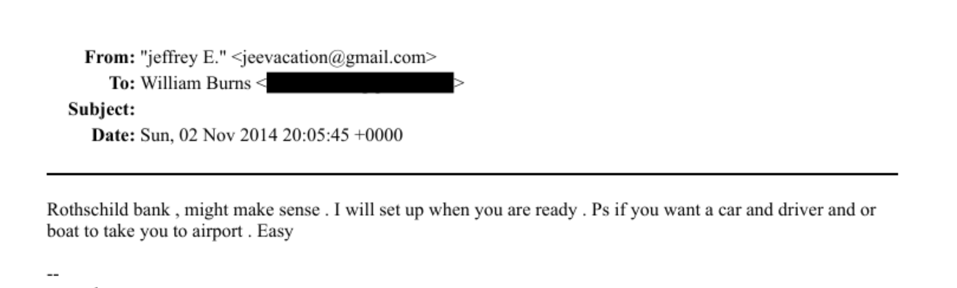 It's unclear if Burns took Epstein up on the offer. But hours later, Epstein emailed Burns to say he'd "set up" Burns with a bank "when you are ready." He also offered "a car and driver and or boat" to take Burns to the airport.
