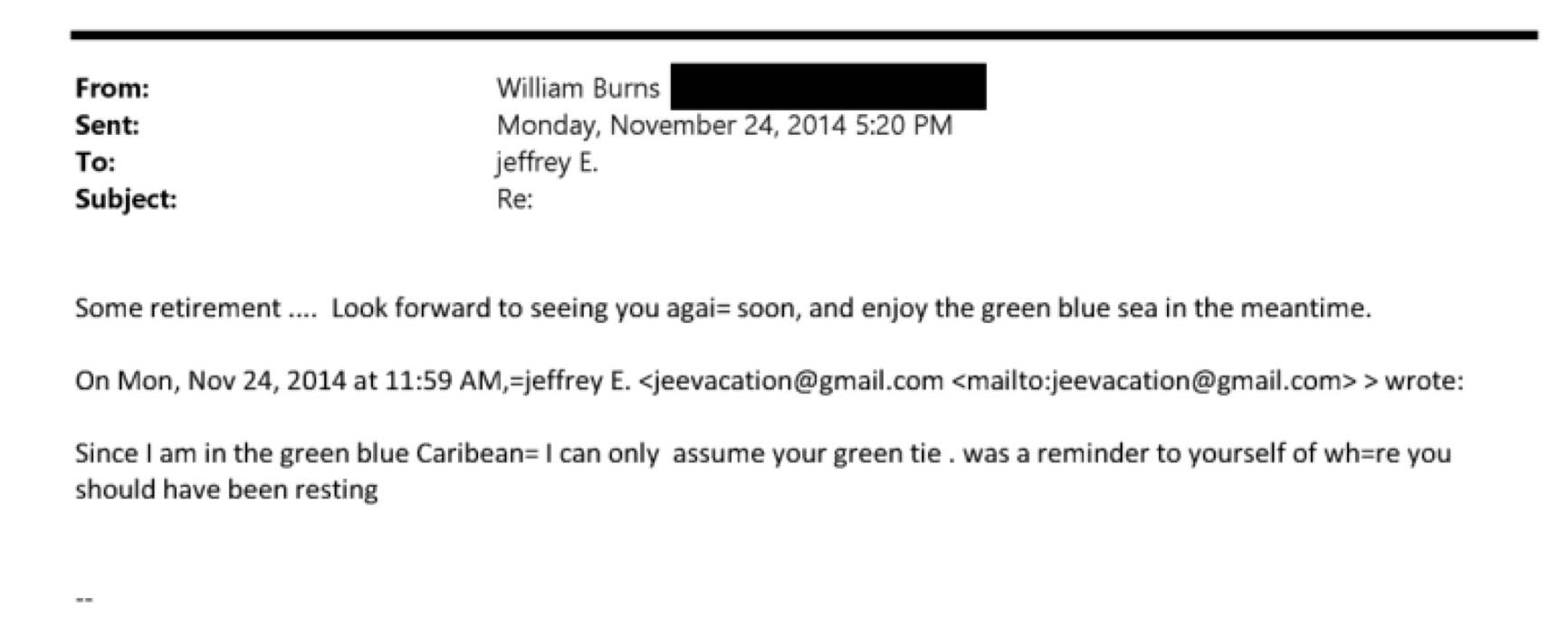 After joining Kerry in Oman, Burns traveled with the then-secretary of state to Vienna for further nuclear negotiations. Epstein emailed Burns during the trip to comment on his attire, writing, "Since I am in the green blue Caribean [sic] I can only assume your green tie . was a reminder to yourself of where you should have been resting." "Some retirement," Burns responded. "Look forward to seeing you again soon, and enjoy the green blue sea in the meantime." Burns wore a green tie in his official portrait as Biden's CIA director.