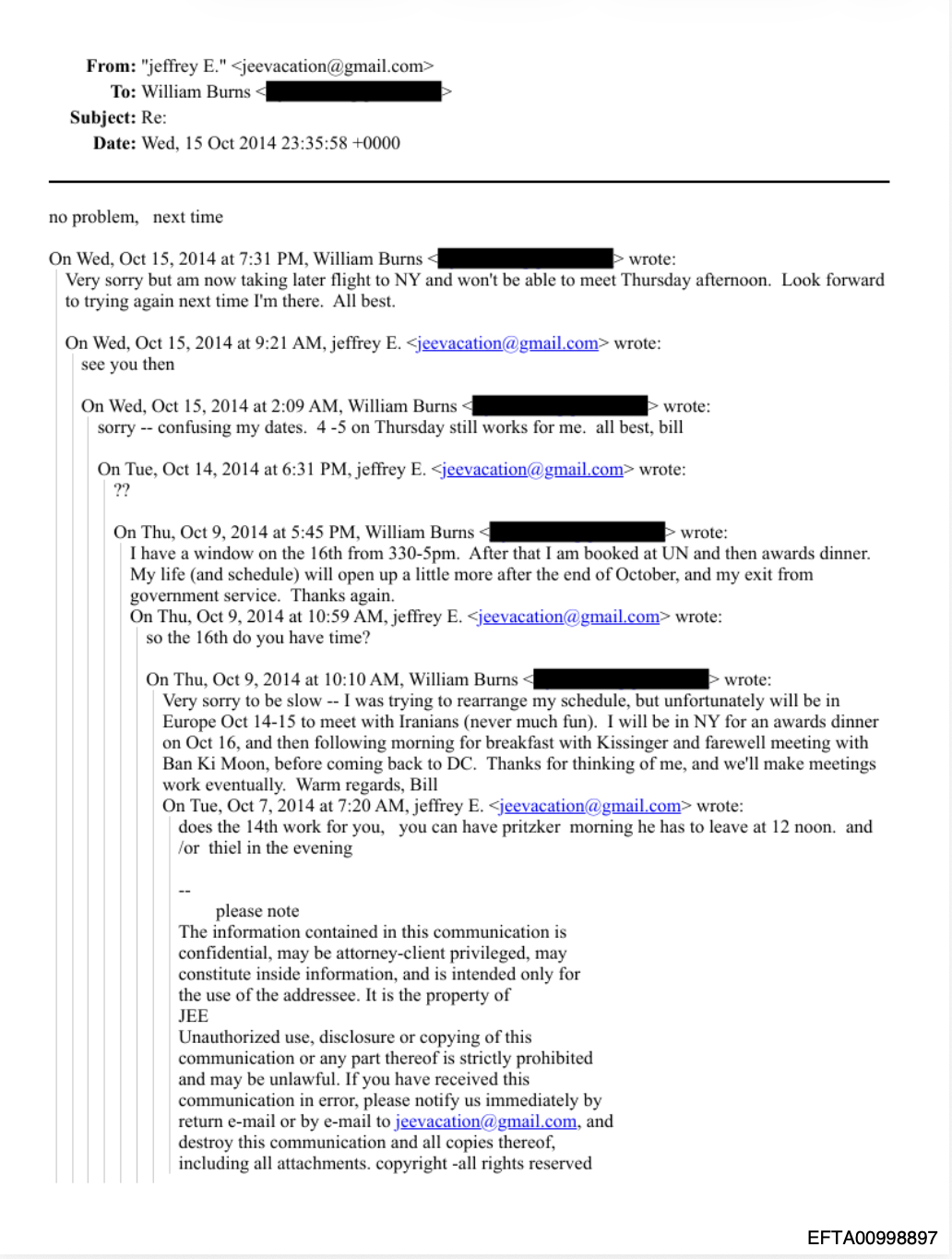 "I was trying to rearrange my schedule, but unfortunately will be in Europe Oct 14-15 to meet with Iranians (never much fun)," Burns wrote. "I will be in NY for an awards dinner on Oct 16, and then following morning for breakfast with Kissinger and farewell meeting with Ban Ki Moon, before coming back to DC. Thanks for thinking of me, and we'll make meetings work eventually."