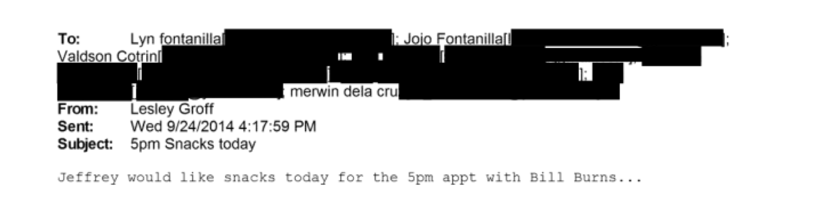 The meeting scuttled by Burns's trip to negotiate with the Iranians came just a few months after he joined Epstein for lunch at a lobbying firm in Washington, D.C., and visited the financier's home in New York City, according to emails, text messages, and Epstein's personal calendar. The pair held a meeting at the offices of Steptoe & Johnson in August 2014 and at Epstein's Manhattan mansion on the evening of Sept. 24, 2014, where the sex predator asked his staff to provide them with "snacks," emails show.