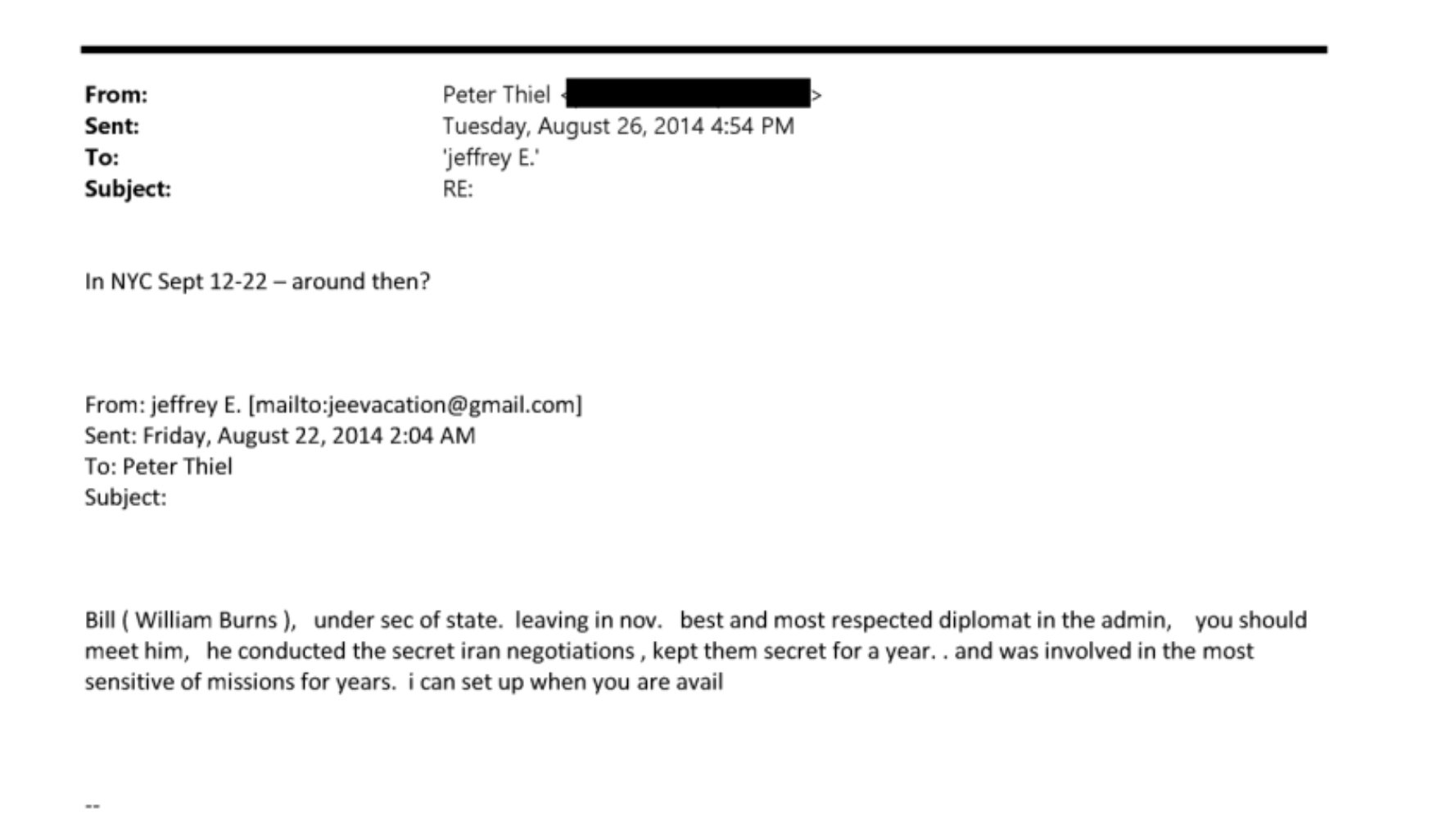 Epstein also offered to introduce Burns to Peter Thiel, text messages show, and told Thiel in an email that Burns was the "best and most respected diplomat in the admin."