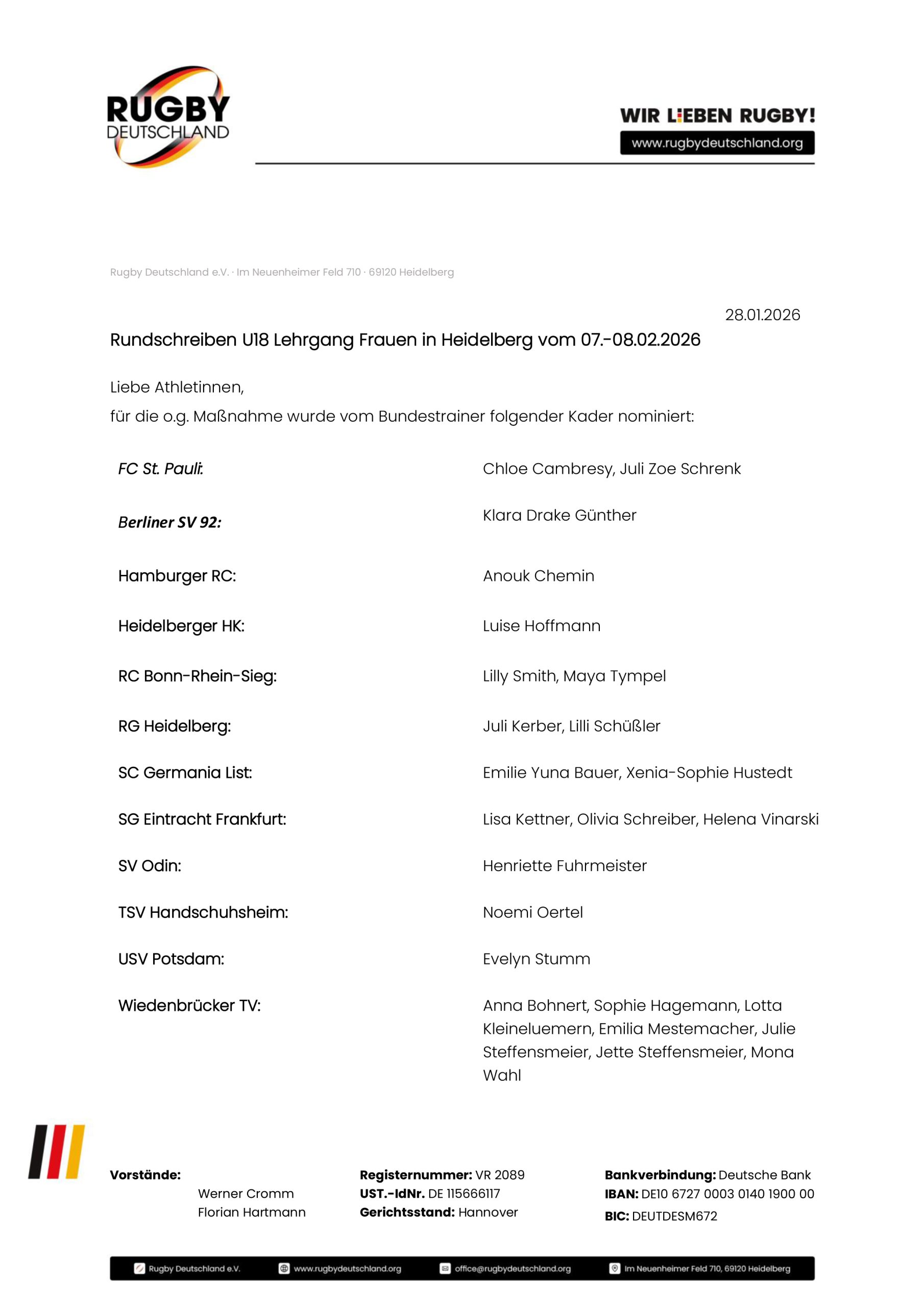 Für Catharina und Leonie aus unserer Frauenmannschaft geht es bereits heute Abend nach Heidelberg zu einem Trainingslehrgang der 15er Frauen Nationalmannschaft. Juli und Chloe aus unserer Mädchen U18 reisen am nächsten Wochenende zu einem Sichtungs- und Trainingslehrgang ebenfalls nach Heidelberg.