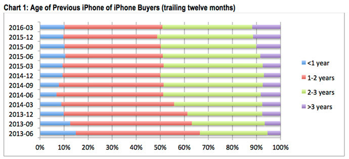 Три года назад примерно две трети владельцев смартфонов Apple имели устройства, возраст которых составлял от одного до двух лет. Теперь таких насчитывается примерно 51%. Эксперты считают, что причина кроется в изменении политики работы операторов сотовой связи и, в частности, касается субсидий на покупку нового мобильника.
