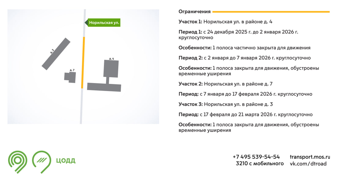 На участках улицы Норильской стала недоступна для движения одна полоса. Об этом сообщают Департамент транспорта Москвы и ЦОДД.