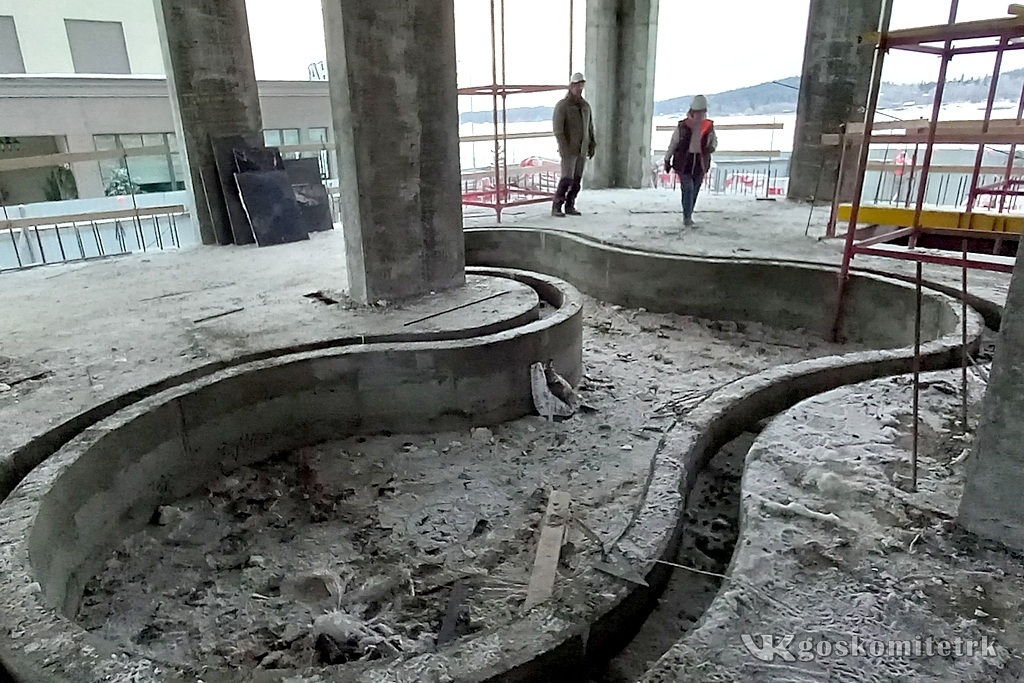 Сейчас на стройплощадке возведен свайный фундамент с ростверком и фундаментной плитой, монолитные колонны подвала и первого этажа, колонны под чаши бассейнов, стены и перекрытия подвала.
