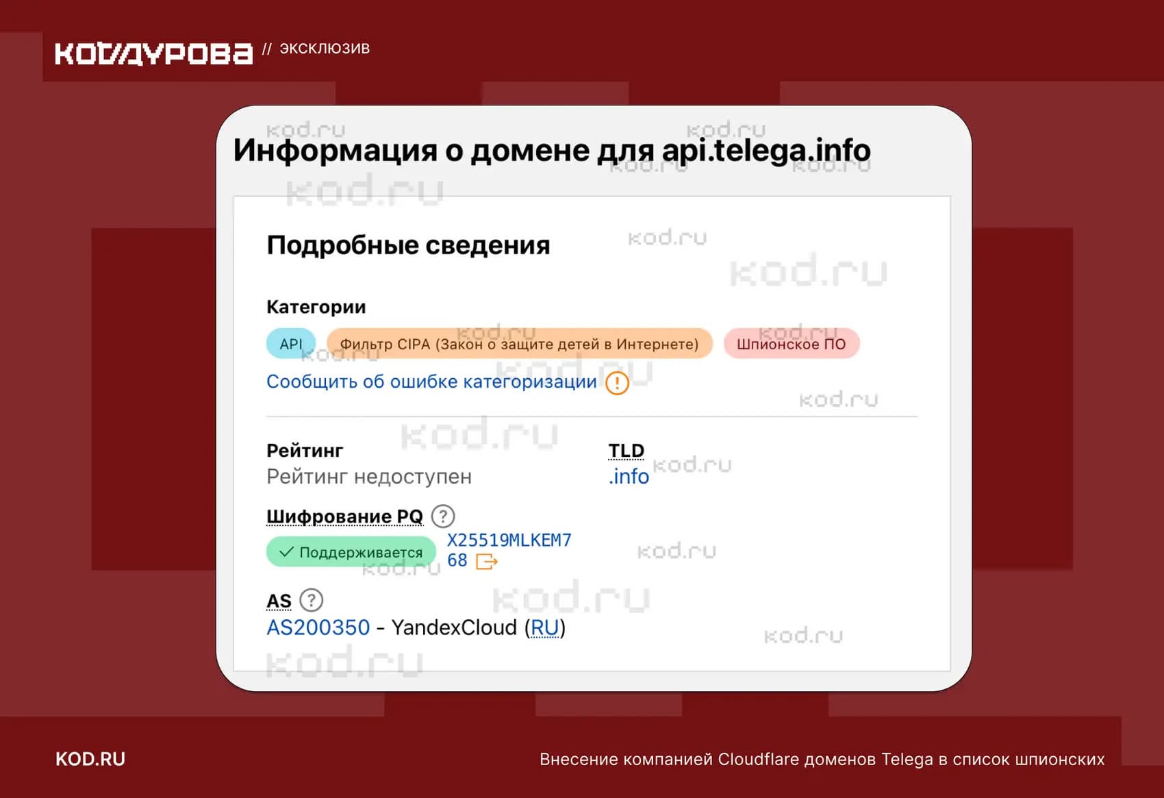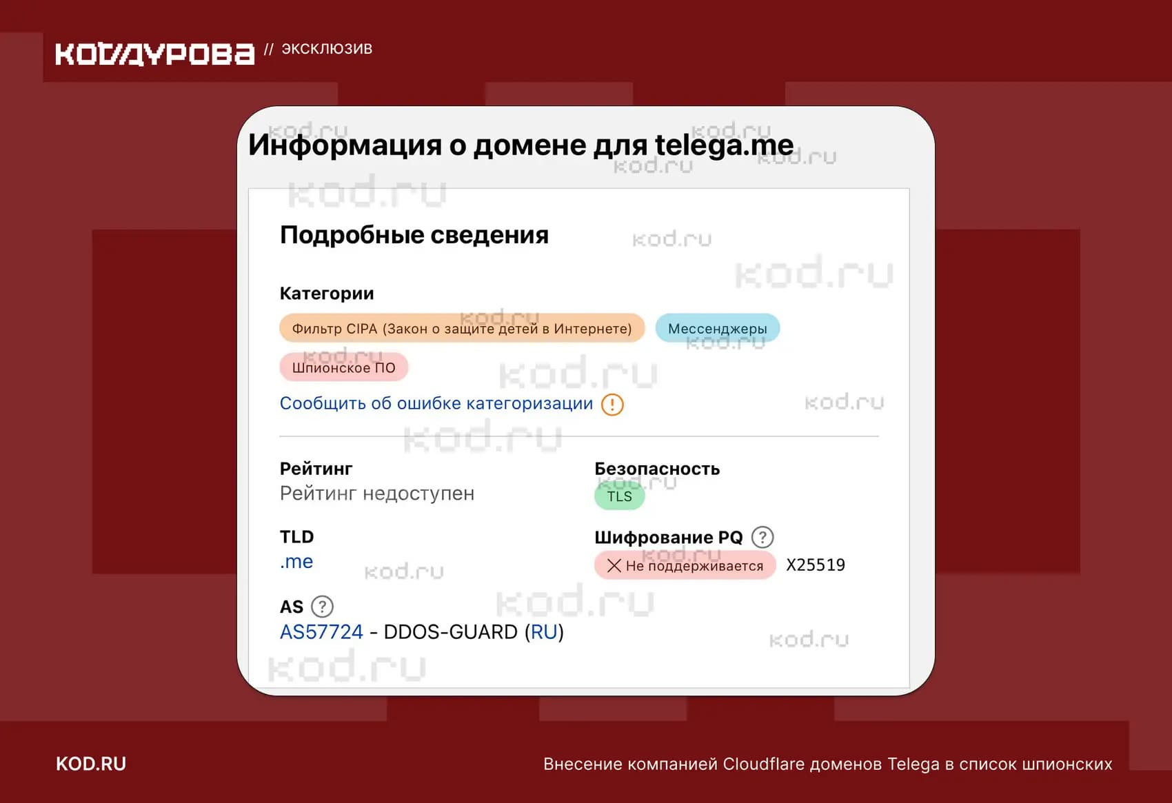 Cloudflare признал два домена проекта Telega — telega.me и api.telega.info — шпионским ПО. Как пишет «Код Дурова», именно после этого началась фактическая блокировка проекта на существующих площадках: вслед за отметкой Cloudflare был отозван TLS-сертификат, выданный удостоверяющим центром GlobalSign.