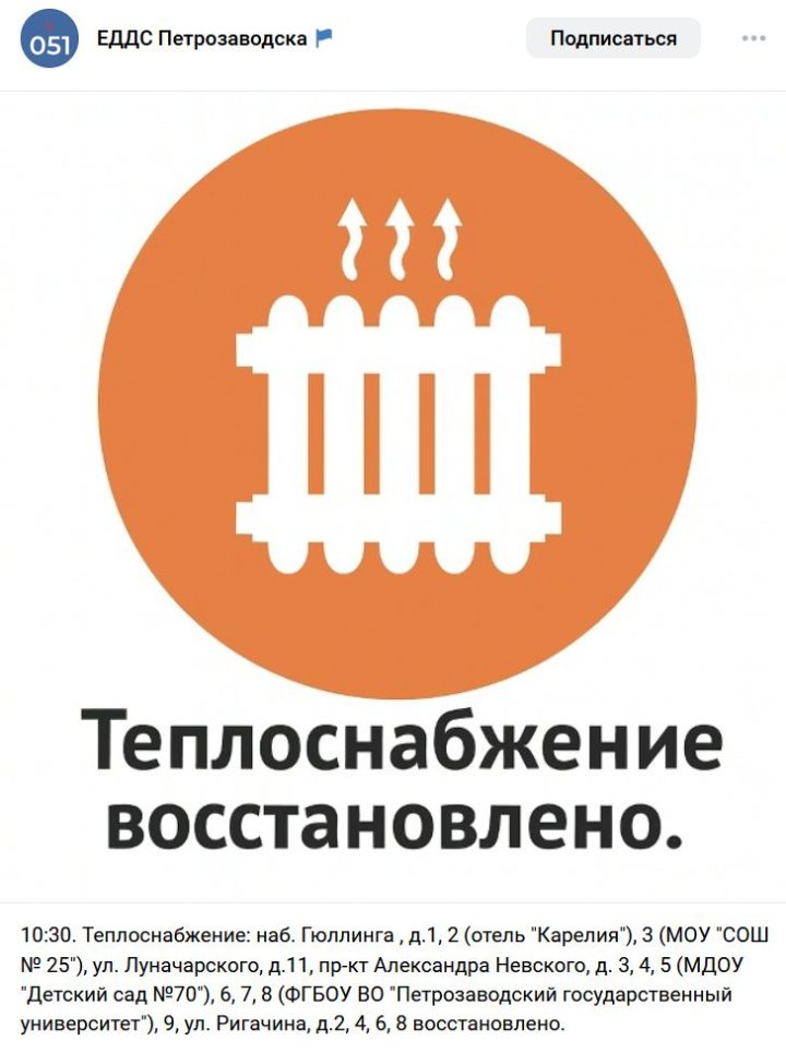 Как сообщает ЕДДС Петрозаводска, отопление отключали в отеле «Карелия», школе № 3, детском саду № 70, а также в одном из корпусов ПетрГУ. Тепла не было в более чем десяти домах, а именно: