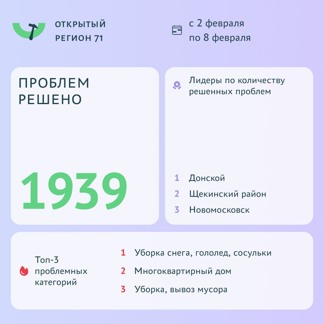 В период с 2 по 8 февраля с помощью портала "Открытый регион 71" решили 1940 проблемы. Об этом сообщает Министерство цифрового развития и связи Тульской области.
