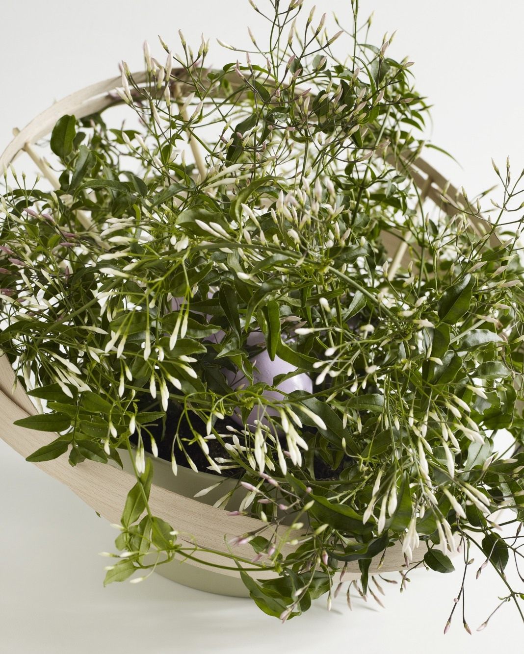 Жасмин многоцветковый (Jasminum polyanthum), выделяющийся своим сильным ветвлением от других видов. Это великолепный вьющийся кустарник. В высоту он достигает 1,5-2 м. Овальные, с заостренным краем листья расположены поочередно, красуются слегка волнистым краем и темно-зеленым окрасом. Многочисленные трубчатые цветки, отгиб у которых разделяется на 5 лопастей, собраны в рыхлые верхушечные соцветия. Особого очарования этому виду добавляет то, что ярко окрашенные розовые бутоны при распускании становятся белыми. Но самым популярным многоцветковый жасмин делает аромат, более сильный, чем у любого другого вида (с легкостью чувствующийся даже на расстоянии). Цветет этот жасмин с февраля и до августа. Сегодня к этому виду относят и ранее выделяемый как самостоятельный вид Жасмин тончайший (Jasminum gracillimum), хотя внешне он немного отличается от базовой формы. Это компактная лиана с очень тонкими, обязательно опущенными побегами, очень простыми листьями длиной до 3,5 см с сердцевидным основанием, опушкой снизу и более необычным окрасом зелени – светло-зеленым. Но главная разница – в цветках. У бывшего тончайшего, а сегодня даже не рассматривающегося как отдельная форма многоцветкового жасмина цветки собраны в зонтики соцветий, венчик у них разделяется на 8 заостренных ланцетных «лепестков». В диаметре цветки многоцветкового жасмина достигают 2,5 см и распускаются в январе-марте.