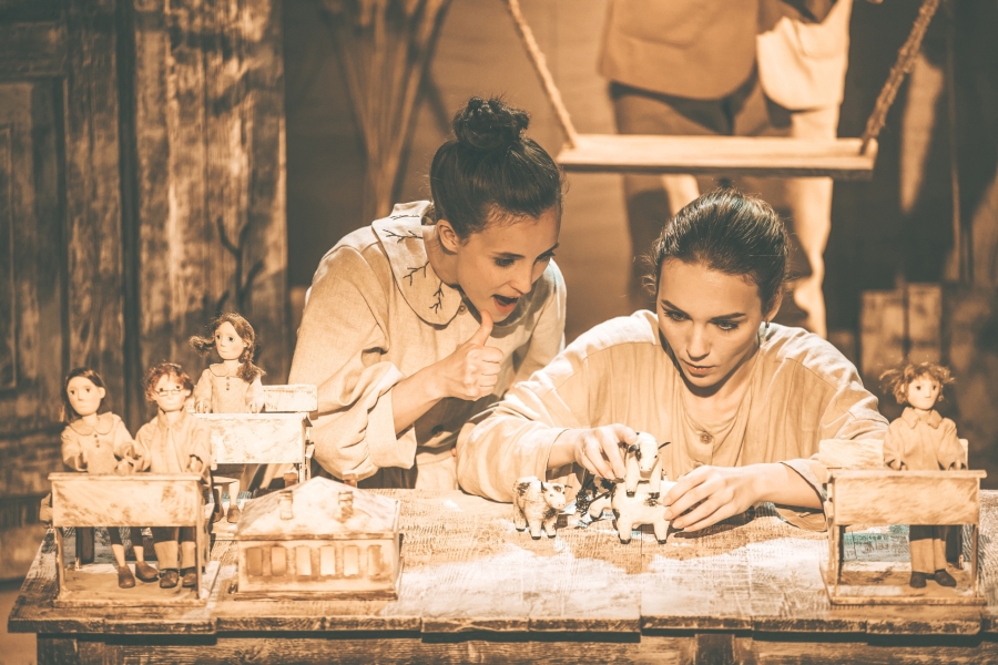 Рязанское село воссоздаётся в поставке скрупулезно, тщательно и с любовью (художник-постановщик Никита Запаскин). Деревенские избы, храм, дом священника, школа – миниатюры выполнены достоверно и узнаваемо. Забавные игрушечные коровки разбредаются по полям. «Дунька! Айседора!» – деловито покрикивают хозяюшки. Свет, горящий в окошках, наполняет уютный кукольный мирок жизнью, и он разрастается до размеров Вселенной. «Константиновские мы!»