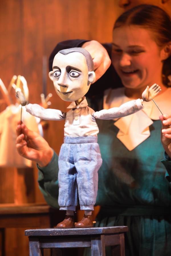 Атмосфера спектакля теплая, ламповая. Каждая деталь – тактильно манящая. Особенно куклы, нарочито простые, но такие живые в руках артистов. Чудо оживления происходит постоянно, причем с самыми неожиданными предметами. Из доски и юбки создается древняя старуха, из жердей и верёвки – корова. И самый пронзительный образ спектакля – беженцы, которые появляются с приходом войны. Их нескончаемый поток рисуется обыкновенными палочками, которые артисты по кругу передают друг другу и с глухим стуком ударяют об пол. Монотонно, неумолимо, мучительно…
