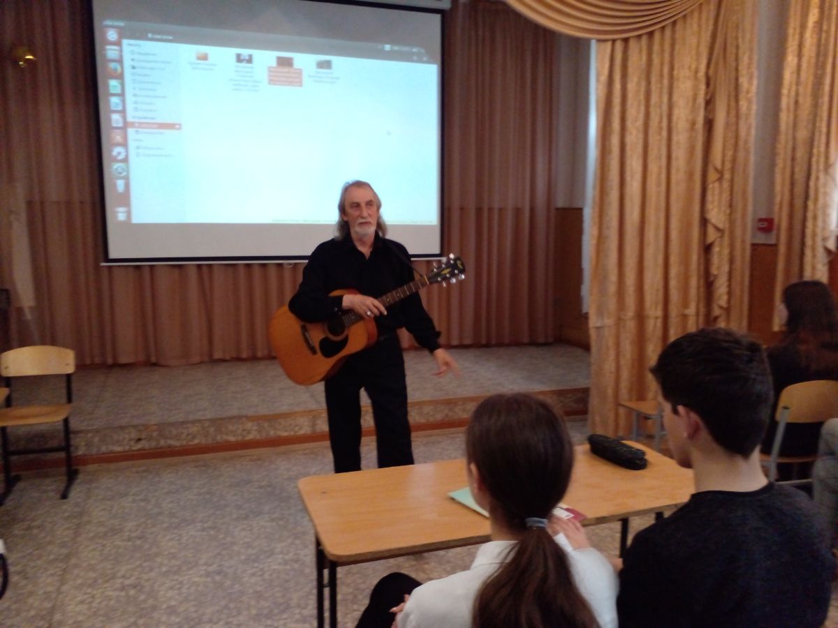 На мероприятие был приглашен Владимир Георгиевич Грачёв – поэт-бард, лауреат многих фестивалей авторской песни, Заслуженный работник культуры и лауреат государственной премии Республики Крым. Он рассказал о зарождении авторской песни, о Музее Владимира Высоцкого в поселке Грэсовский. Представил слушателям авторскую песню «Посвящение Высоцкому», а также спел знаменитые песни «Братские могилы» и «Вершина».