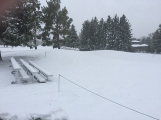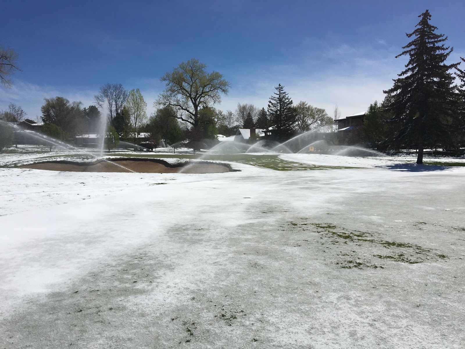 outlets, was that we ended up playing in the snow. Eventually, the snow won over and forced Saturday to be a complete day off, but we had “chamber of commerce weather” on Sunday that melted the snow and allowed us to shotgun the players and complete 54 holes. As we were preparing for that final round and the snow was thawing (see numerous pictures included here), a number of great questions came up from coaches and officials about how to handle the snow.| Using the Sprinklers to Help Thaw the Snow |