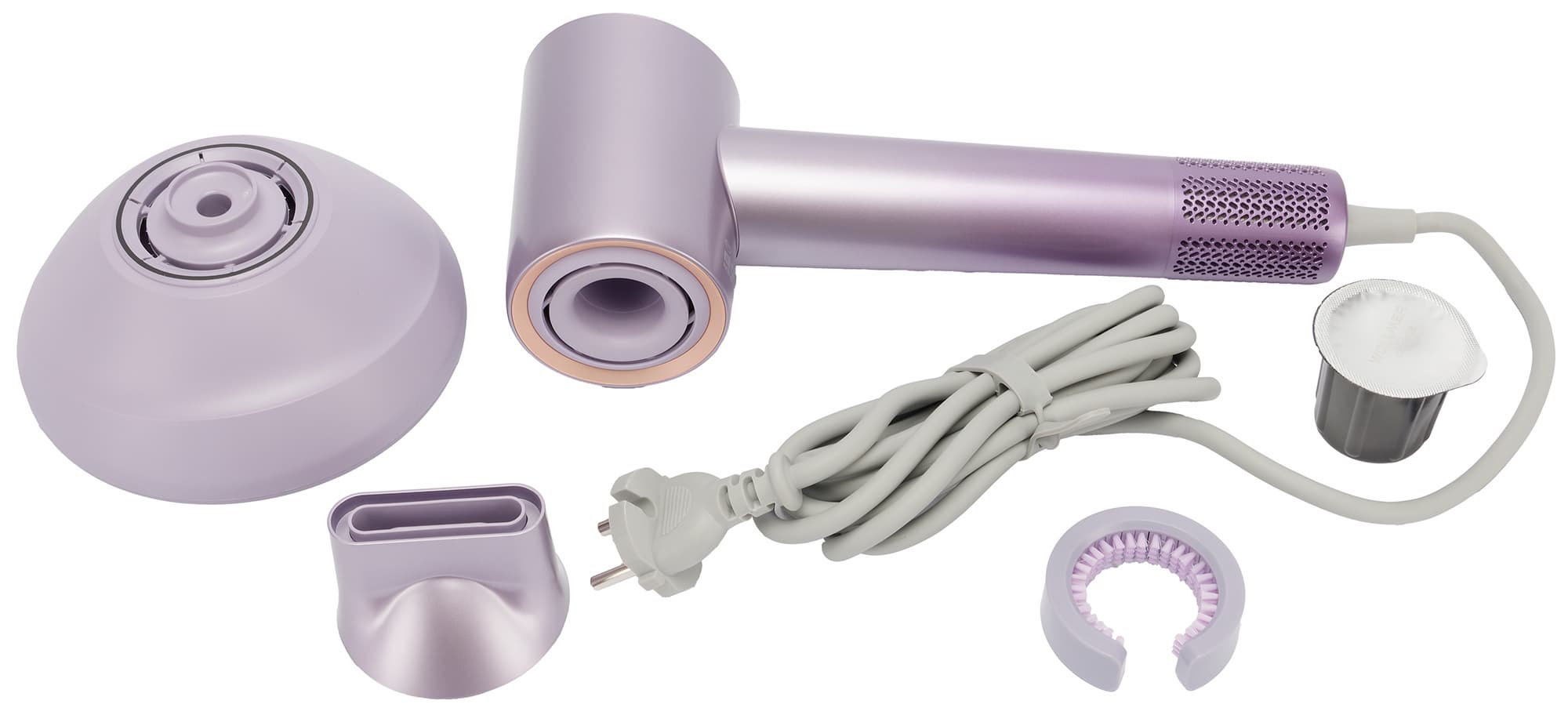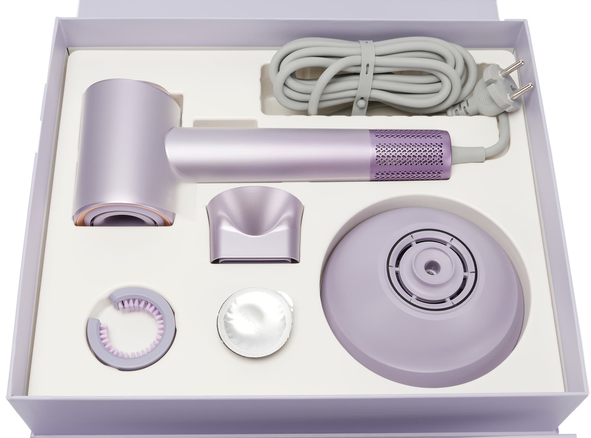 Комплект состоит из: самого фена, концентратора, диффузора, капсулы с маслом камелии, аксессуара для очистки и руководства по эксплуатации.