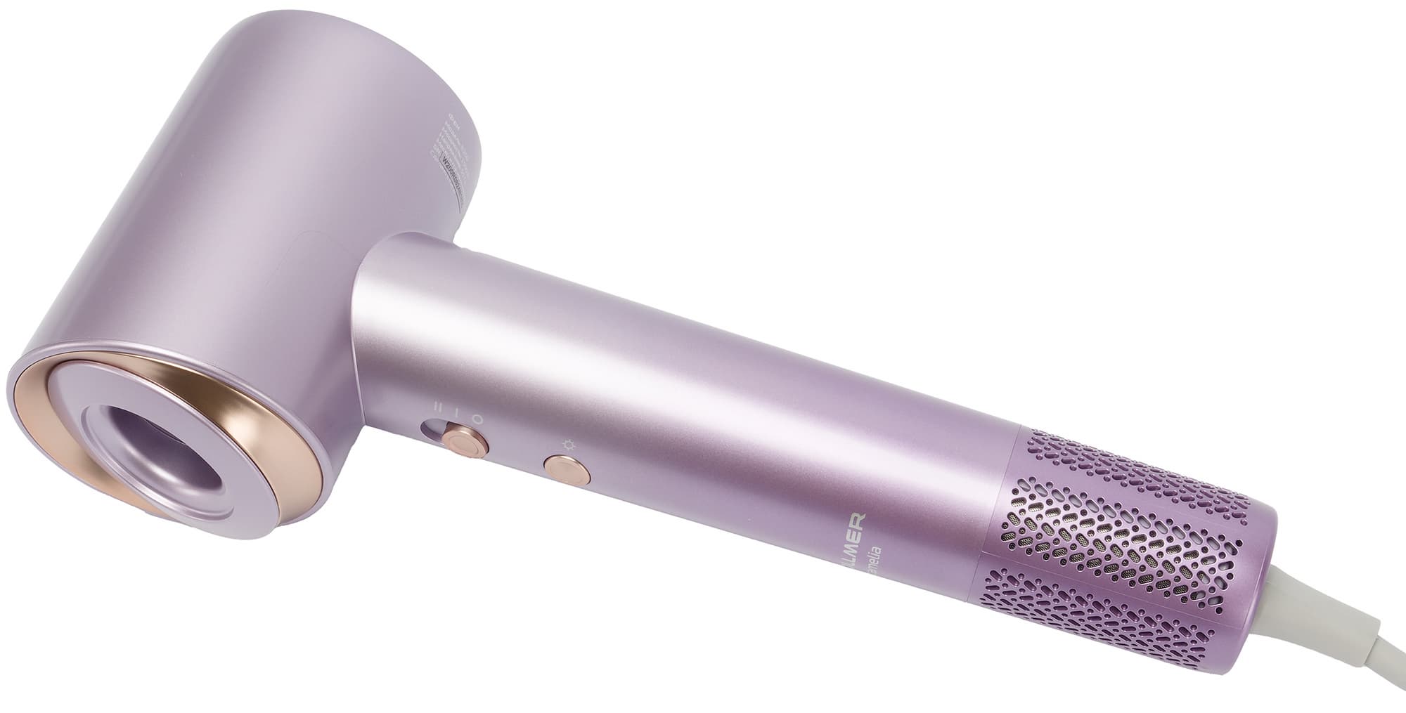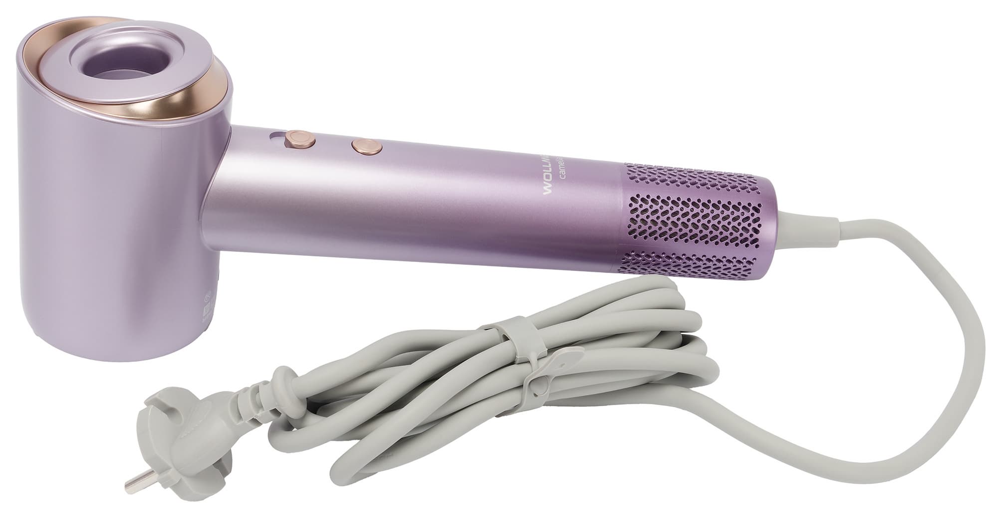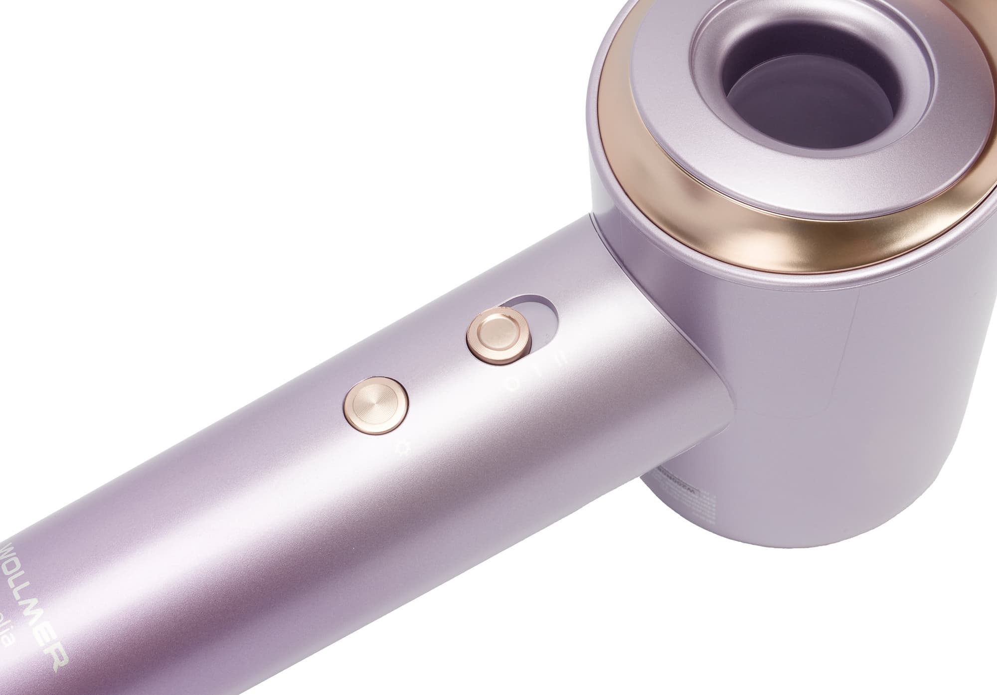Корпус фена Wollmer R200 выполнен из гладкого пластика нежно-сиреневого цвета. Поверхность с перламутровым отблеском окрашена градиентом. Небольшое количество вставок благородного оттенка приглушенного золота гармонично дополняют красивую расцветку.