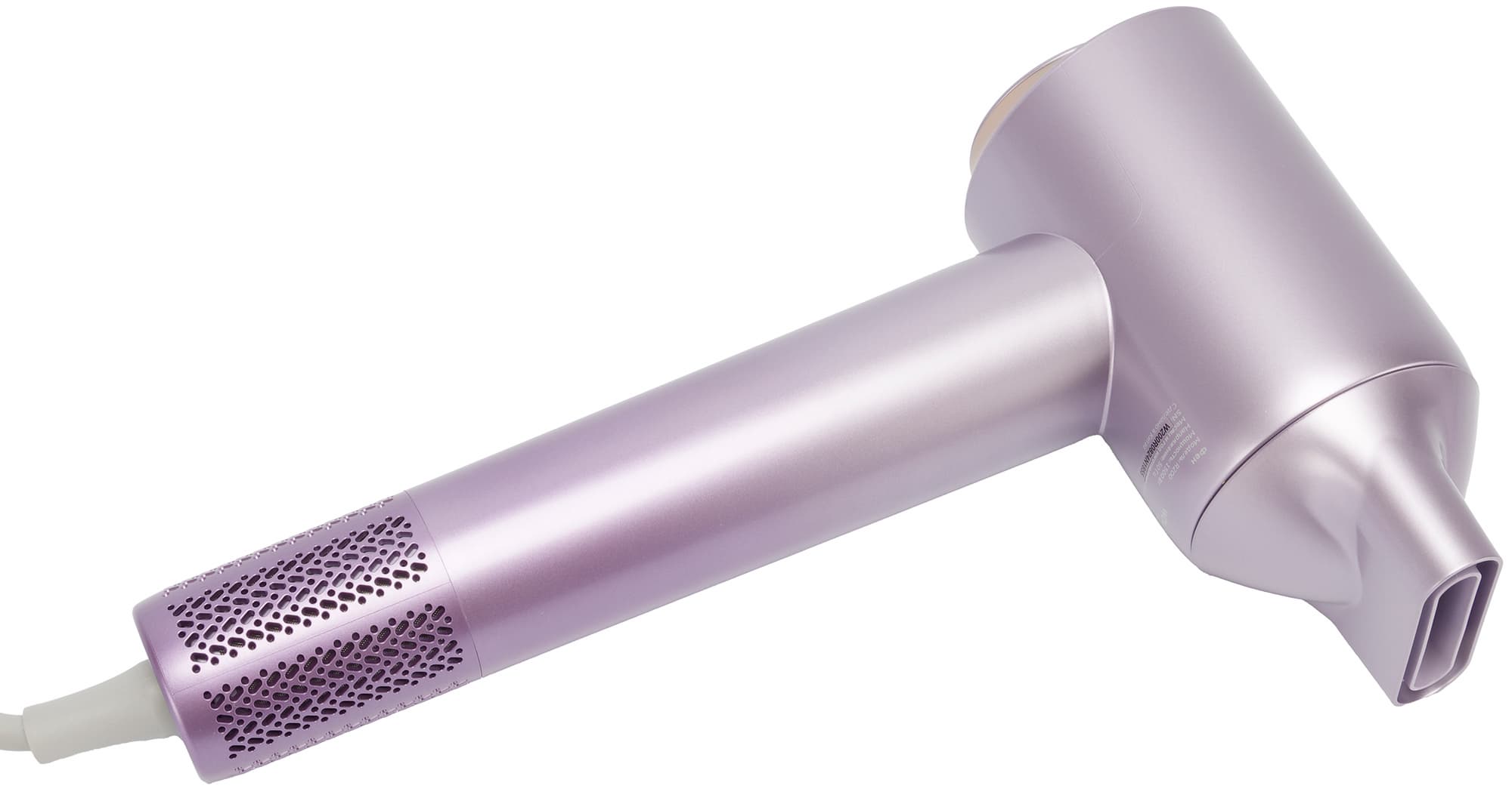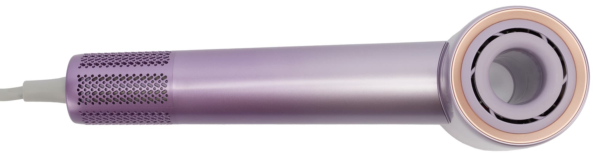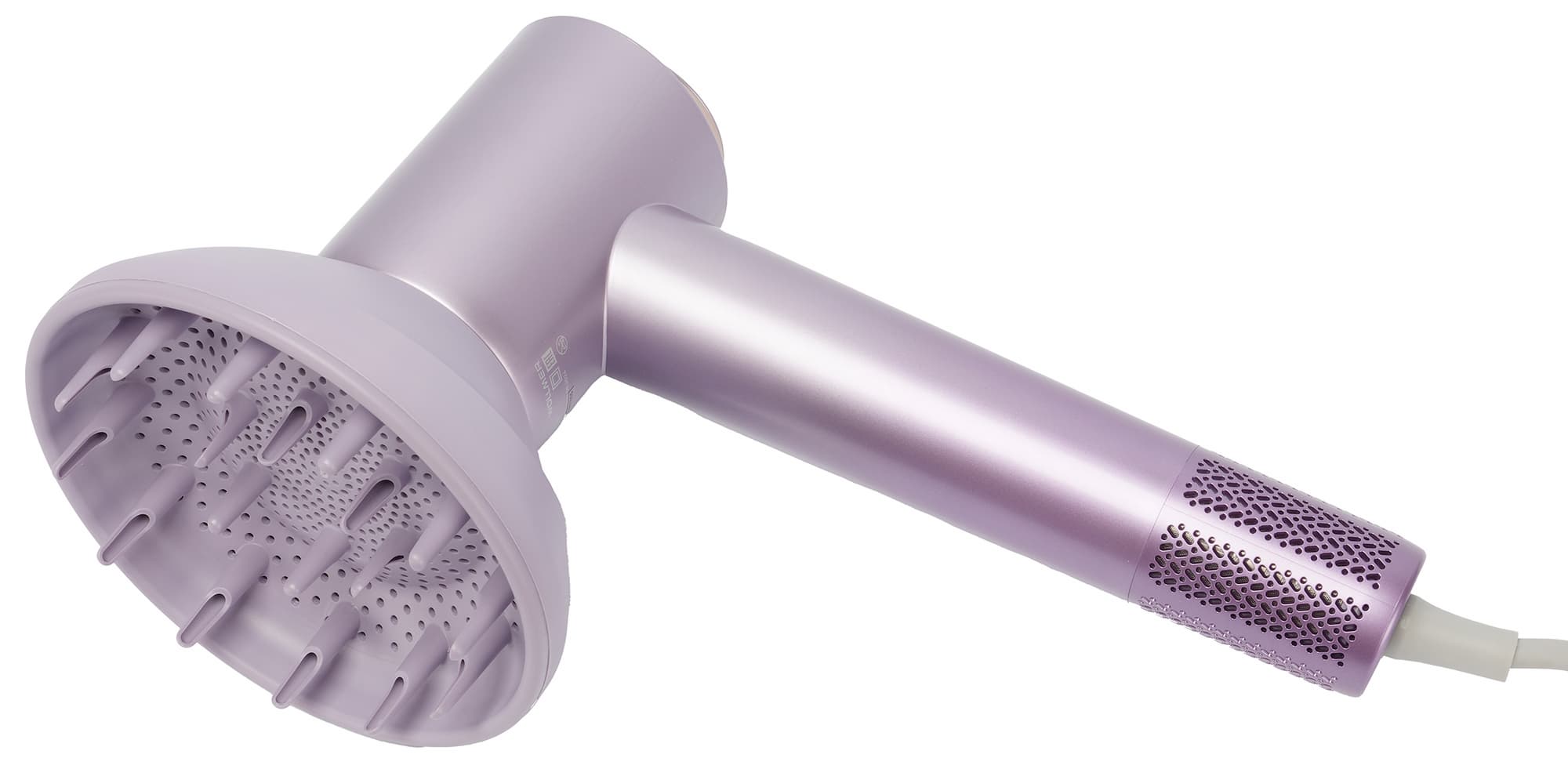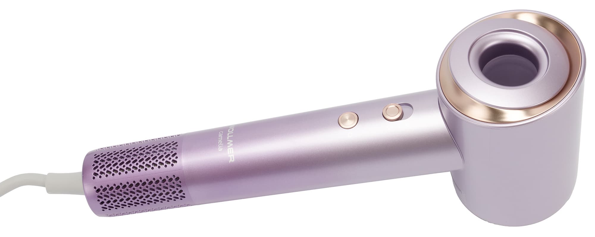 Корпус фена Wollmer R200 выполнен из гладкого пластика нежно-сиреневого цвета. Поверхность с перламутровым отблеском окрашена градиентом. Небольшое количество вставок благородного оттенка приглушенного золота гармонично дополняют красивую расцветку.