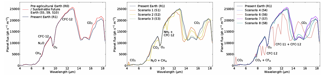 Если воздух слишком чист, астрономам придется искать другие факторы. Например, следы глобального сельского хозяйства. В сценарии S8 (Агро-сверхдержава), где планета превращена в гигантскую ферму для прокорма огромного населения, атмосфера насыщается специфическим коктейлем: метан (CH₄), оксид азота (N₂O) и аммиак (NH₃). В сочетании с остаточными промышленными фреонами это создает уникальный спектральный отпечаток, который может засечь не оптический HWO, а инфракрасный интерферометр LIFE.