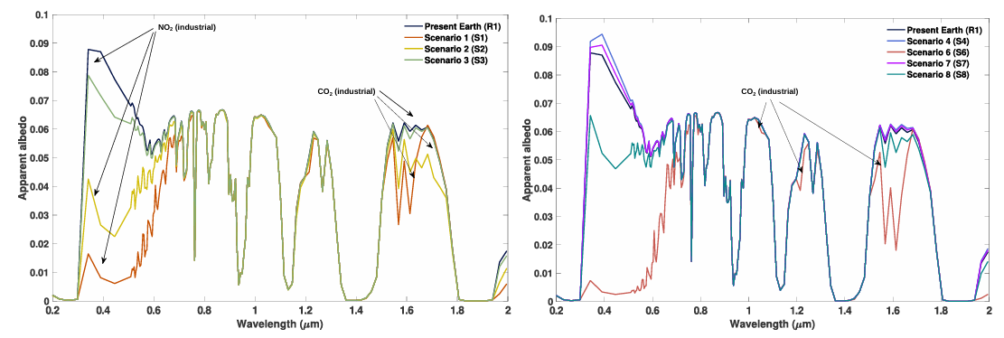 В сценарии S1 (Лазерный геоинжиниринг) цивилизация доводит концентрацию CO₂ до критических 11 000 ppm (сегодня на Земле около 420 ppm). Чтобы выжить, они вынуждены распылять диоксид серы в стратосфере, отражая солнечный свет. Для внешнего наблюдателя такая планета будет сиять маркерами загрязнения: диоксид азота (NO₂) в паре с углекислым газом.