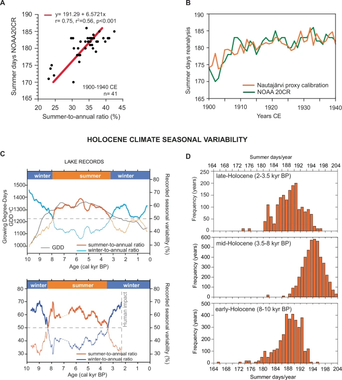 Озера Наутаярви в Финляндии и Дисс-Мер в Англии — это природные архивариумы. На их дне ил ложится слоями: светлый слой — весна и лето, темный — зима. Изучив слои за последние 10 000 лет (период Голоцена) и сопоставив их с моделями солнечной активности и таяния льдов, ученые реконструировали историю европейского лета.