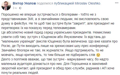 Пропрезиденсткий блогер Уколов заявил, что встреча была тайной, так как Порошенко не превращает подобное общение в показуху и хочет услышать "простых" людей.