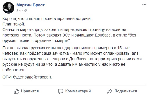 Короче, что я понял после вчерашней встречи. План такой. Сначала миротворцы заходят и перекрывают границу на всей ее протяженности. Потом заходят ЗСУ и зачищают Донбасс, в стиле "без оружия - живи, с оружием - смерть".