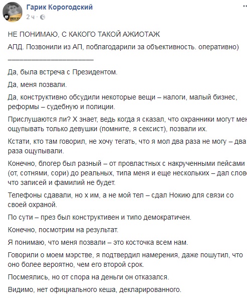 Многих удивило приглашение на встречу Гарика Когородского, сам бизнесмен описал встречу и свои впечатления следующим образом.