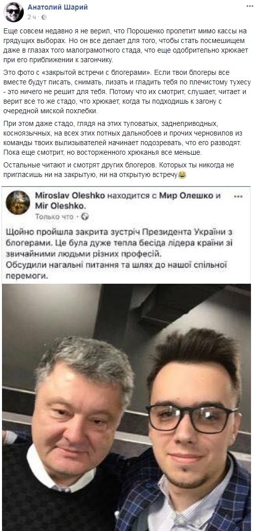 Еще совсем недавно я не верил, что Порошенко пролетит мимо кассы на грядущих выборах. Но он все делает для того, чтобы стать посмешищем даже в глазах того малограмотного стада, что еще одобрительно хрюкает при его приближении к загончику.
