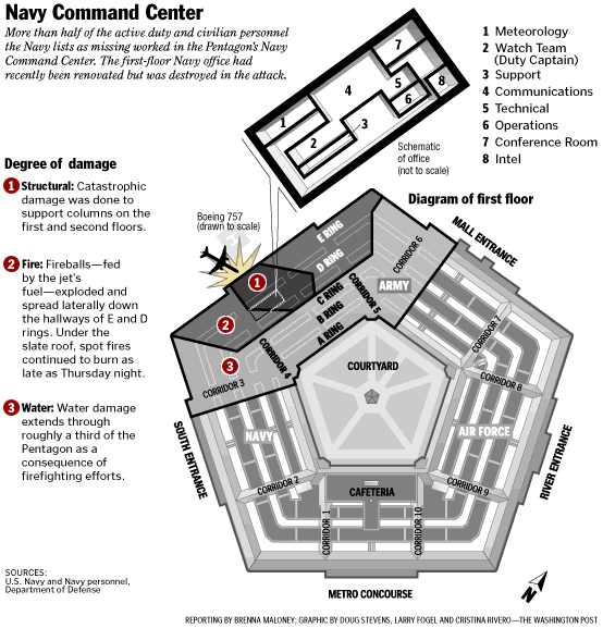 12) Как оказалось, взрыв пришёлся точно на тот сектор Пентагона, который находился на ремонте. Управление по борьбе с терроризмом было оттуда уже выселено, Командный центр морского флота ещё не вселён. В помещениях находился в основном гражданский персонал, занимавшийся их оборудованием. Именно поэтому жертвами оказались в основном гражданские лица. Этим же объясняется малое число погибших – 125 человек (c. 18-19). Кстати, каким-то образом в числе погибших оказался один генерал, которому вообще было нечего делать в этом крыле здания (есть мнение, что его убрали и списали ликвидацию на этот инцидент);